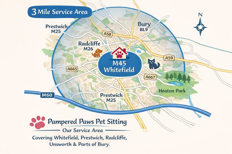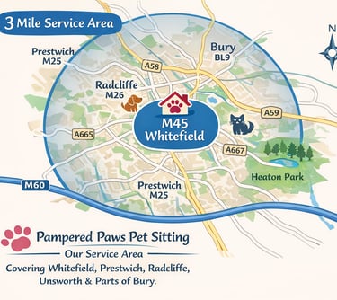 We provide reliable, in-home pet sitting within a 3-mile radius of Whitefield, covering Prestwich, Radcliffe, Unsworth, and parts of Bury.